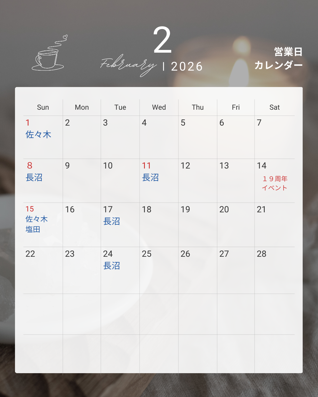 🗓✨ 2月の営業日カレンダー ✨🗓